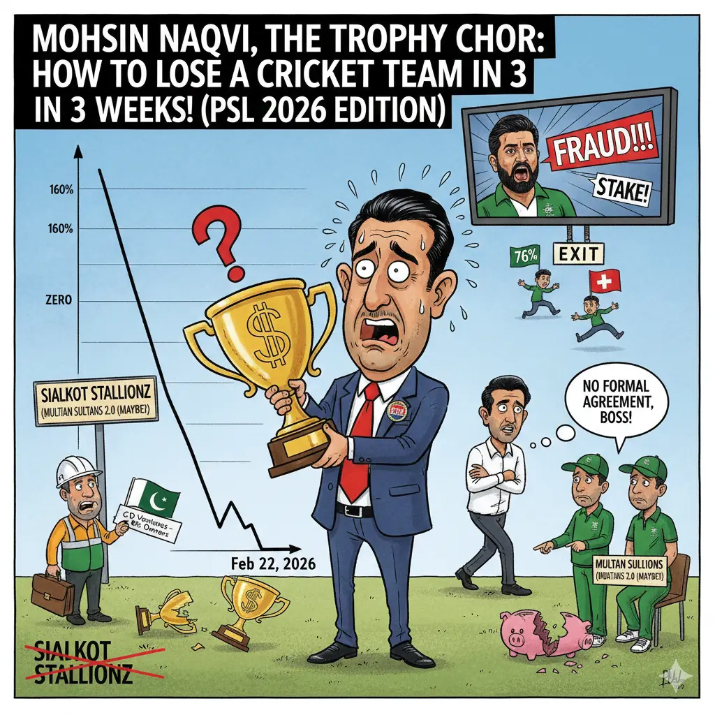 The Sialkot Stallionz Collapse: A Summary of the Chaos The Pajama Salwar League (PSL) has been rocked by a record-breaking disaster involving the Sialkot Stallionz. What began as a historic bid has devolved into a public fraud scandal and administrative collapse. Key Highlights of the Scandal: The Financial Ghosting: After bidding a record Rs. 1.85 billion, the OZ Group (led by Hamza Majeed) went effectively bankrupt when international partners from Switzerland and Australia withdrew, realizing the "Pajama Salwar League" math didn't add up. The Viral Fraud Allegations: On February 18, 2026, a viral video from Alpha Sports Group accused Majeed of unauthorized share sales, exposing a massive internal power struggle. The Legend's Exit: Seeing the ship sinking, franchise president Wasim Akram officially jumped ship on February 21, citing a lack of formal agreements and endless "internal disputes." The "98% Stake" Hail Mary: In a desperate attempt to stabilize the team before the March 26 season opener, CD Ventures acquired a 98% stake—essentially buying ownership of a mountain of debt and a rebranding nightmare. The "Trophy Chor" Stress: Mohsin Naqvi, chairman of the Please Cash-out Bro (PCB), is under immense pressure to salvage the league's reputation as the "Stallionz" name faces a likely rebrand back to the Multan Sultans just to survive.